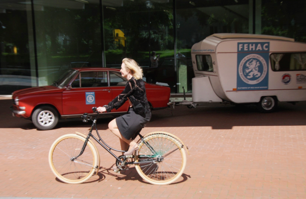 Enthousiast fietsend op een heus historisch rijwiel opende minister Bussemaker de 2016-editie van het Nationaal Congres Mobiel Erfgoed, waarbij opnieuw de Rijksdienst voor het Cultureel Erfgoed te Amersfoort als gastheer optrad.